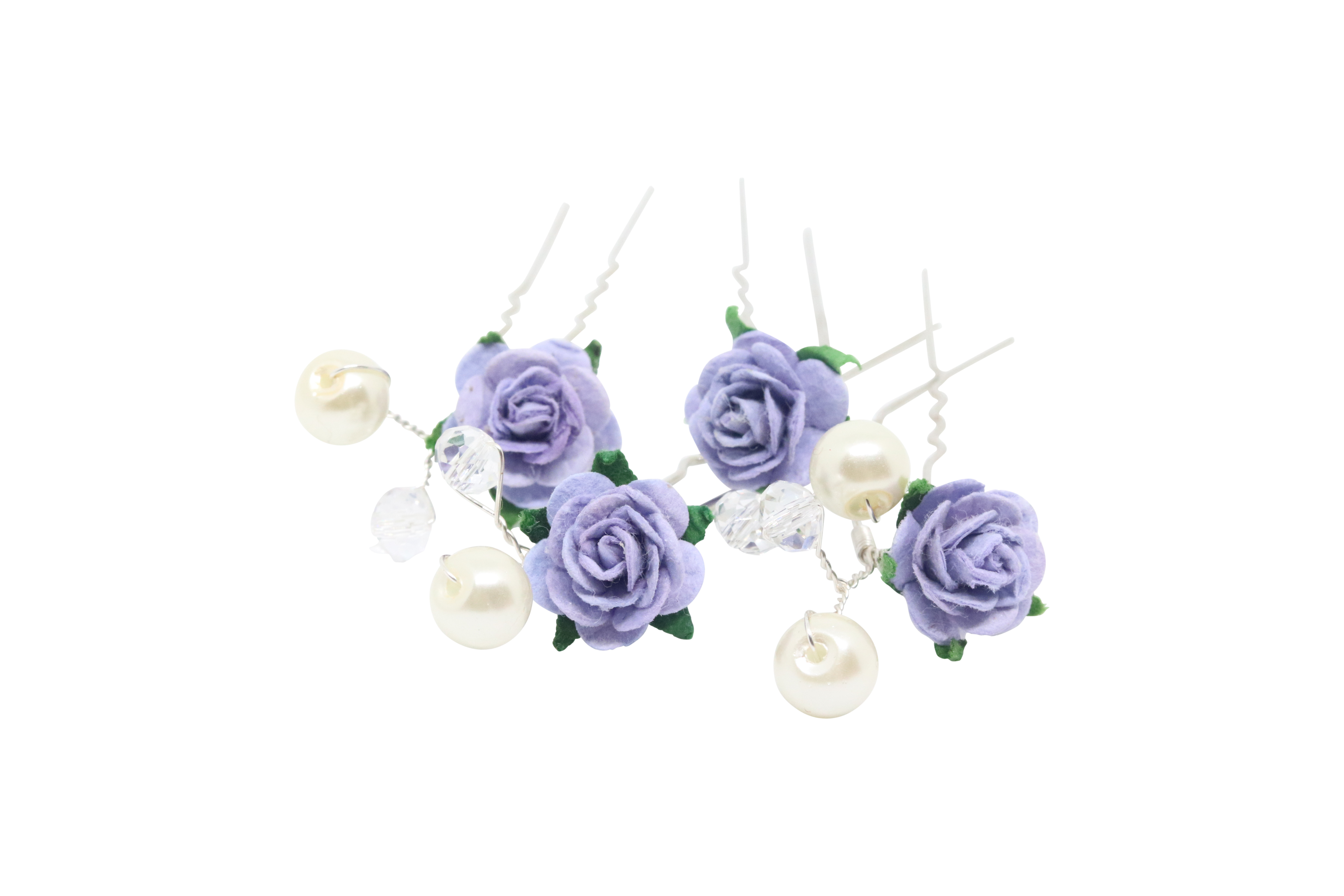 It is embellished with faceted round crystal, purple (lilac) rose made with mulberry paper and tranquil pearly look. It is easy to put-on with hair buns, braids, and other unique hair styles. The metallic tooth of these pins is safely hand wrought which is easy to wear.